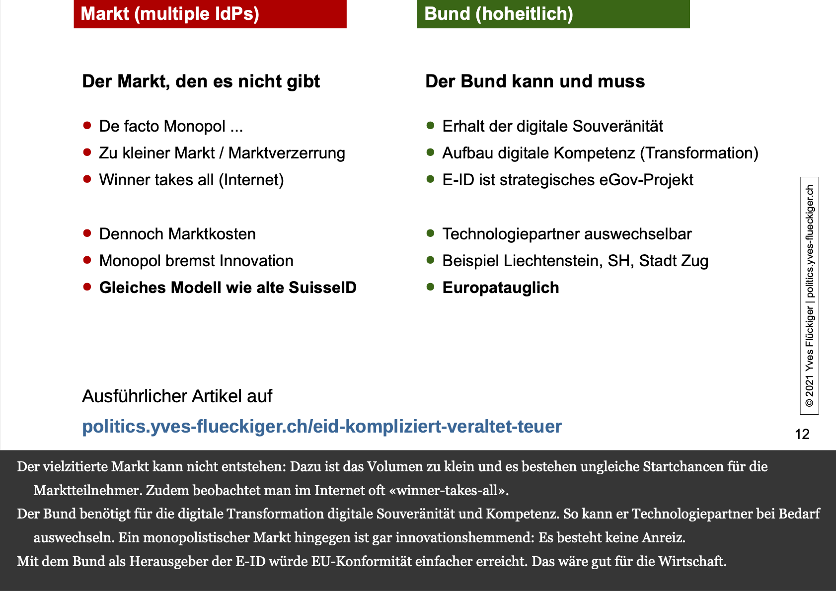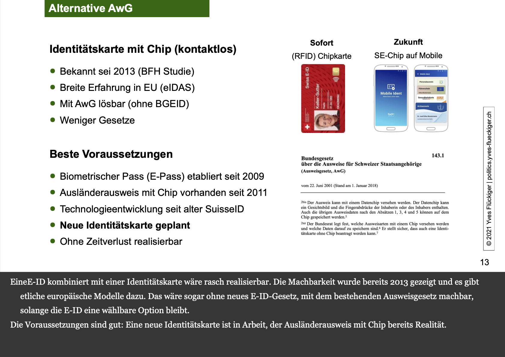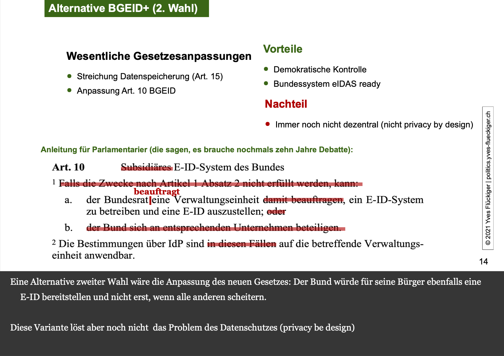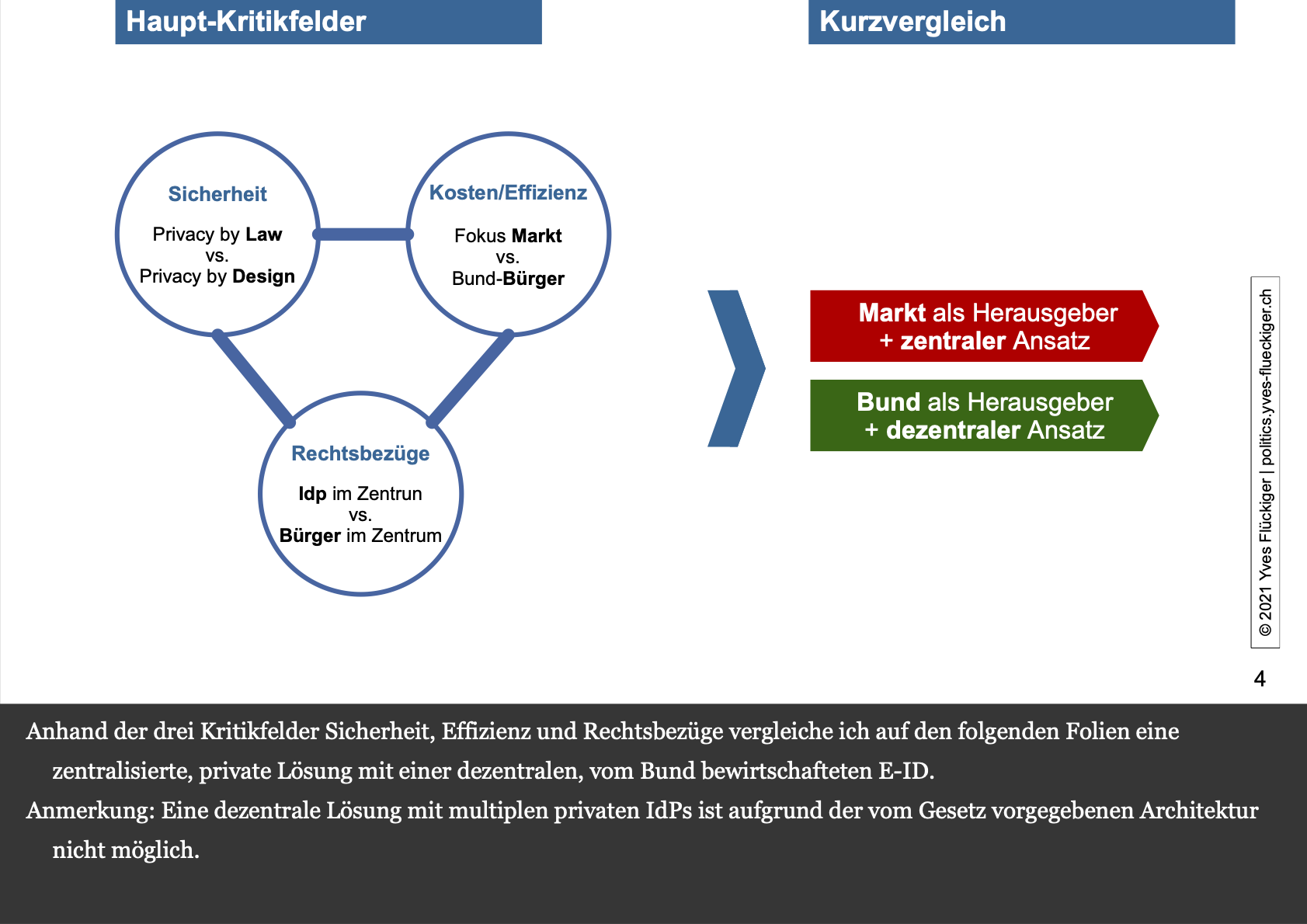 «Die E-ID ist der Ausweis der Zukunft» – unter dieser Prämisse äussere ich als Bürger und IT Fachperson grundlegende Bedenken, die Herausgabe einer staatlichen E-ID an private Anbieter zu delegieren. Anhand von drei Kritikfeldern Sicherheit, Effizienz und Rechtsbezüge vergleiche ich eine zentralisierte, private Lösung mit einer dezentralen, vom Bund bewirtschafteten E-ID. Es werden zwei Alternativen gezeigt, um bei Ablehnung des Gesetzes rasch ein E-ID-System einzuführen – eines, das fortschrittlich ist und den Bürger, statt den Markt ins Zentrum stellt.