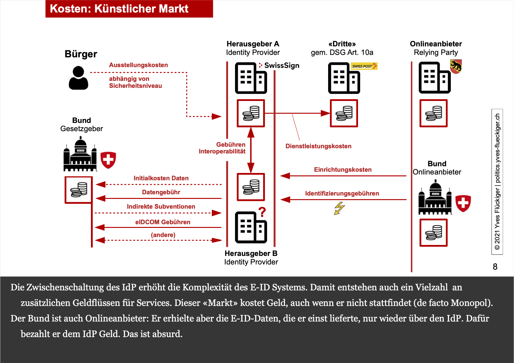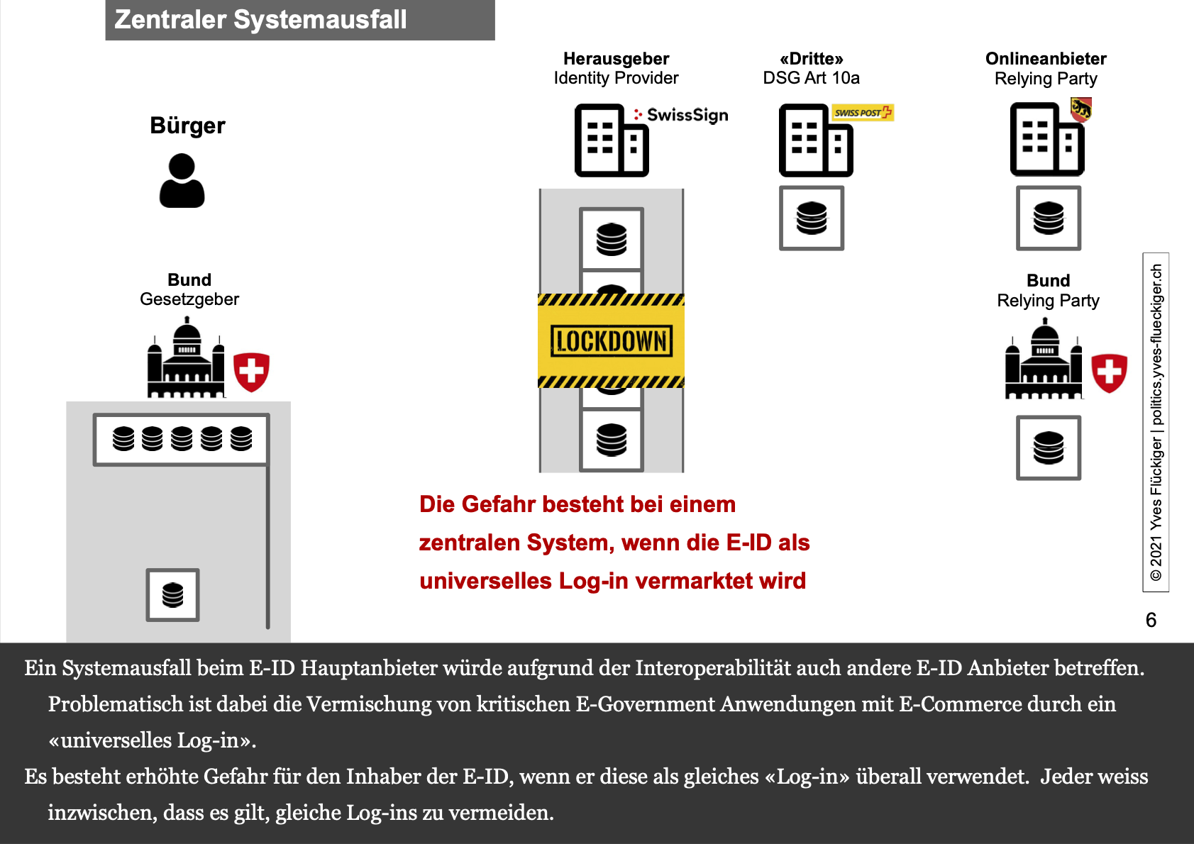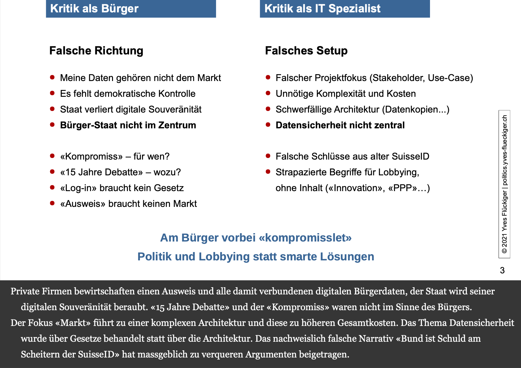 «Die E-ID ist der Ausweis der Zukunft» – unter dieser Prämisse äussere ich als Bürger und IT Fachperson grundlegende Bedenken, die Herausgabe einer staatlichen E-ID an private Anbieter zu delegieren. Anhand von drei Kritikfeldern Sicherheit, Effizienz und Rechtsbezüge vergleiche ich eine zentralisierte, private Lösung mit einer dezentralen, vom Bund bewirtschafteten E-ID. Es werden zwei Alternativen gezeigt, um bei Ablehnung des Gesetzes rasch ein E-ID-System einzuführen – eines, das fortschrittlich ist und den Bürger, statt den Markt ins Zentrum stellt.
