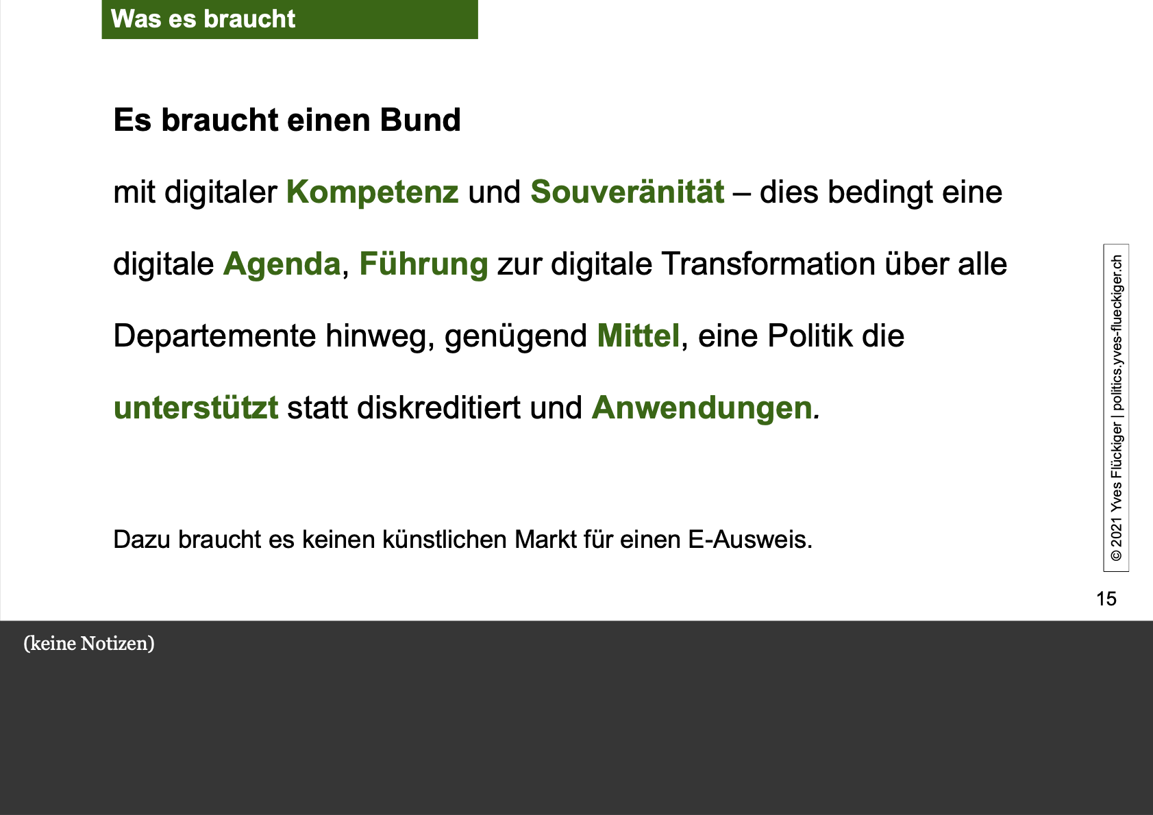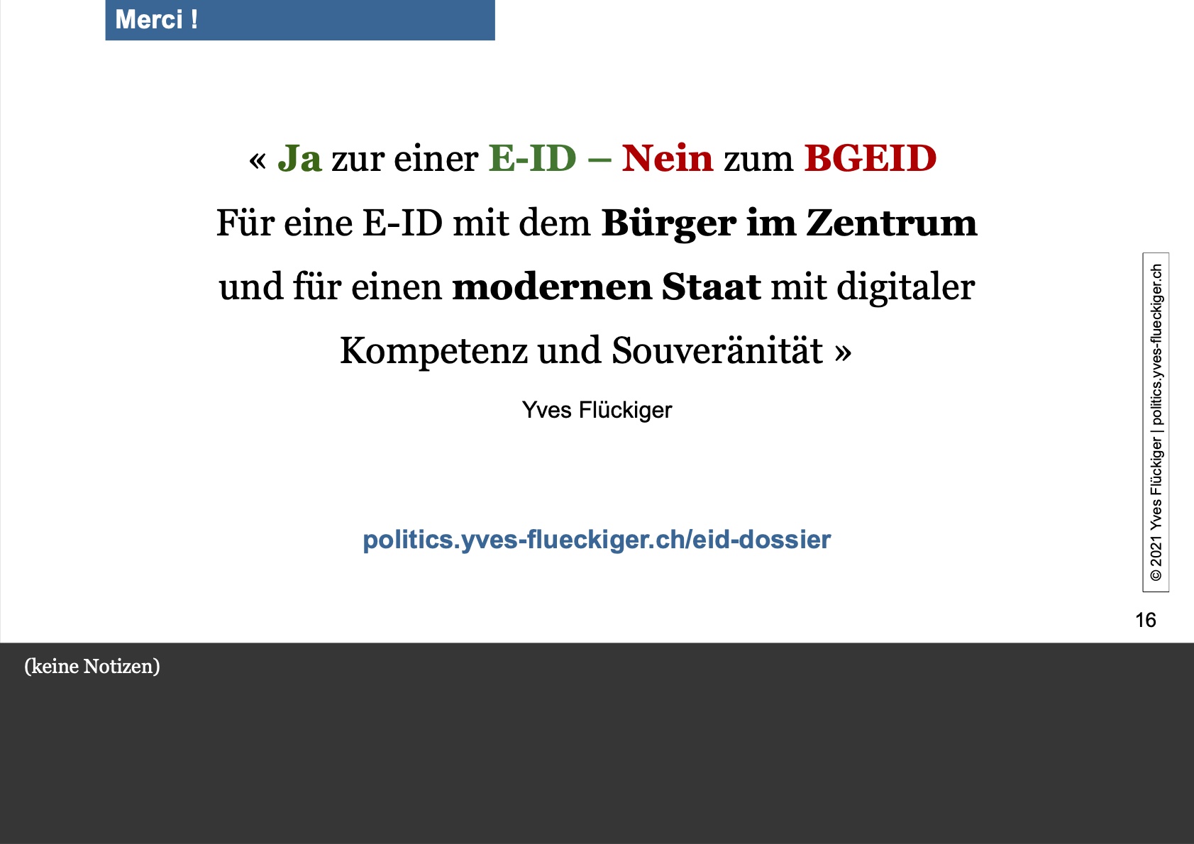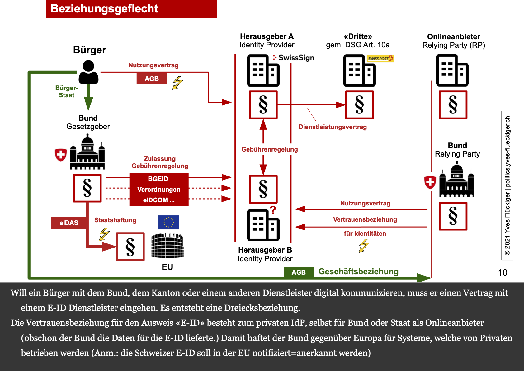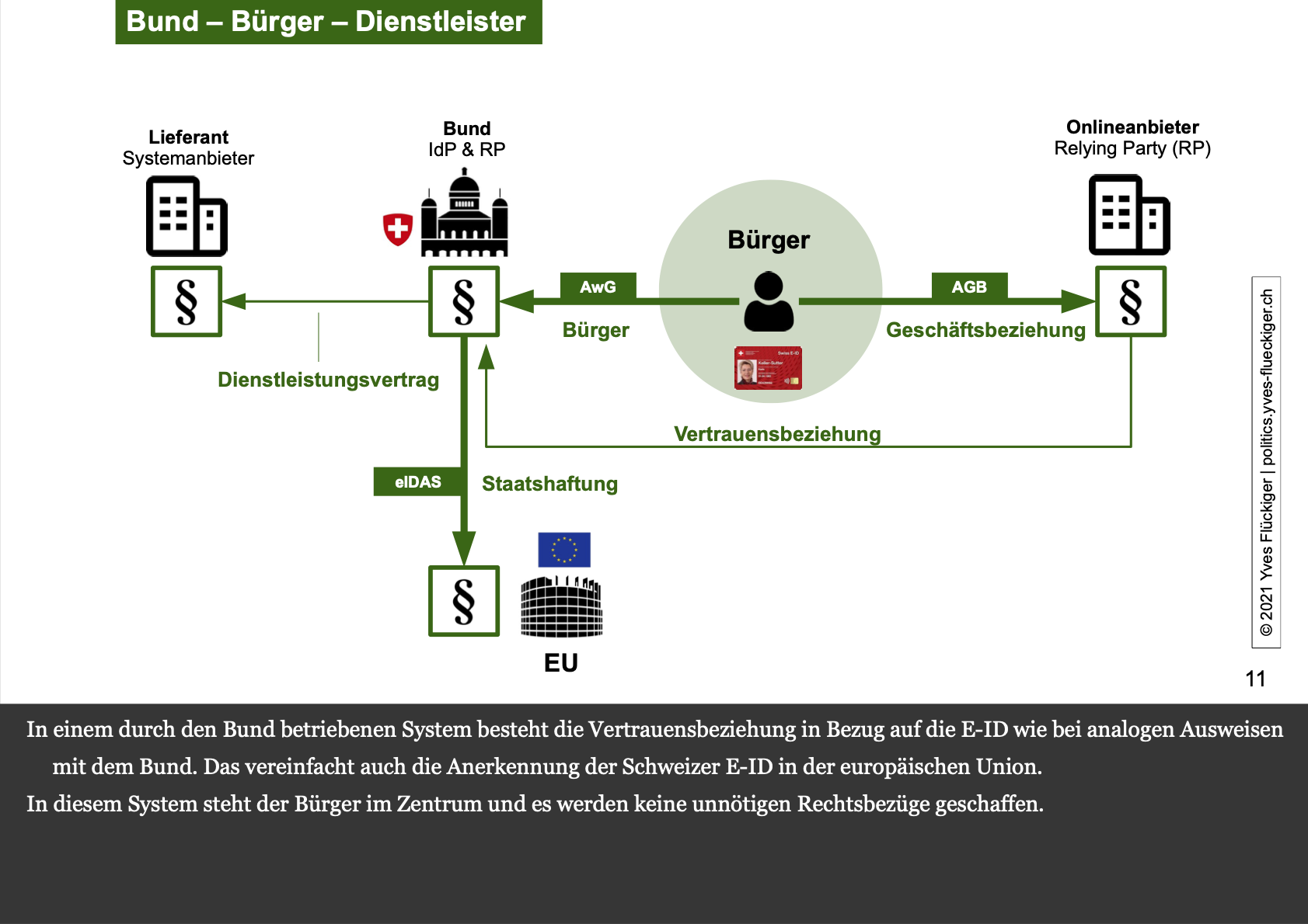 «Die E-ID ist der Ausweis der Zukunft» – unter dieser Prämisse äussere ich als Bürger und IT Fachperson grundlegende Bedenken, die Herausgabe einer staatlichen E-ID an private Anbieter zu delegieren. Anhand von drei Kritikfeldern Sicherheit, Effizienz und Rechtsbezüge vergleiche ich eine zentralisierte, private Lösung mit einer dezentralen, vom Bund bewirtschafteten E-ID. Es werden zwei Alternativen gezeigt, um bei Ablehnung des Gesetzes rasch ein E-ID-System einzuführen – eines, das fortschrittlich ist und den Bürger, statt den Markt ins Zentrum stellt.